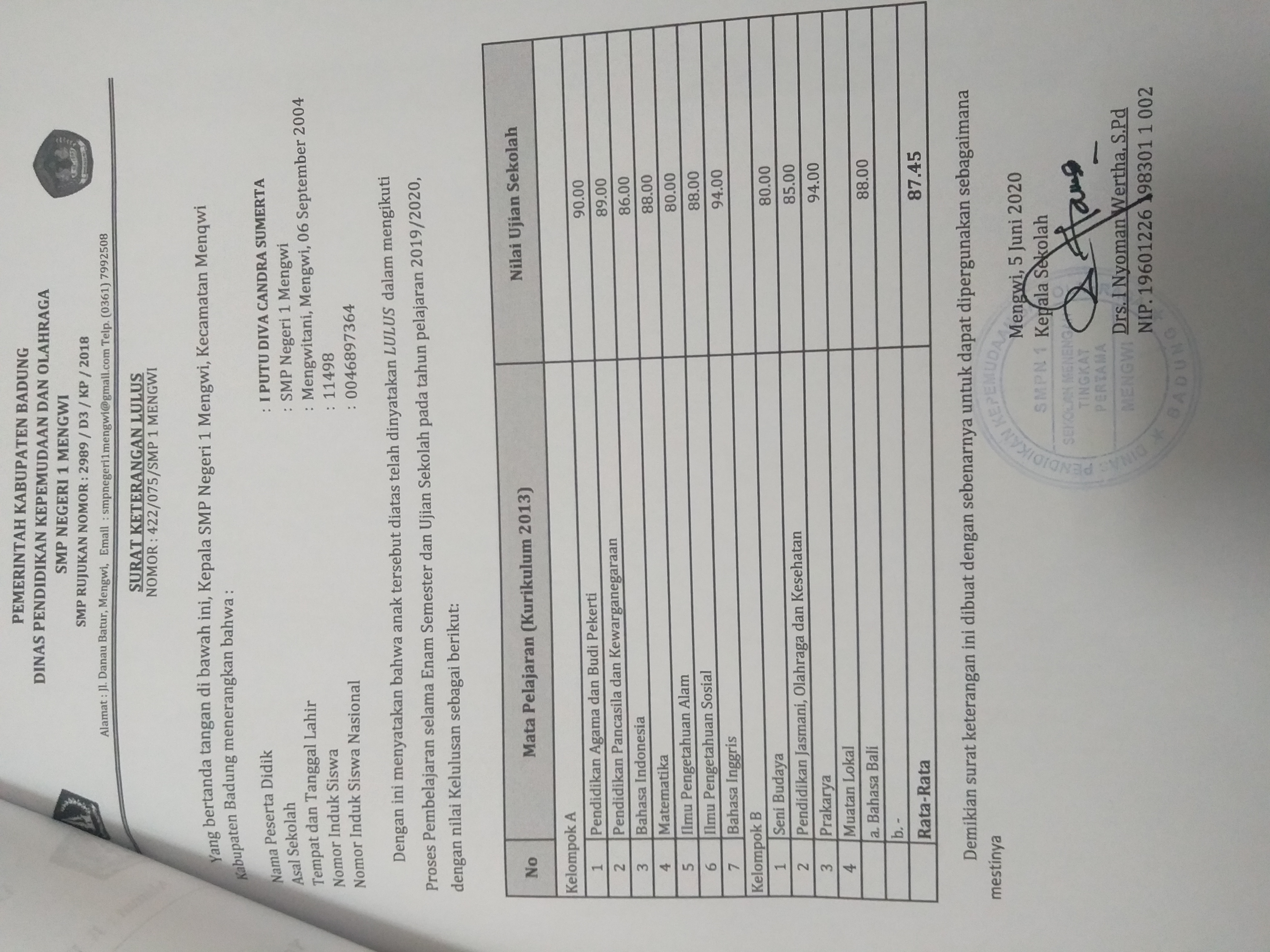 | 2 | I PUTU DIVA CANDRA SUMERRA | Laki-laki | 0046897364 | Jalur Zonasi | 87.45 | Smp negeri 1 mengwi | Terdaftar | |
