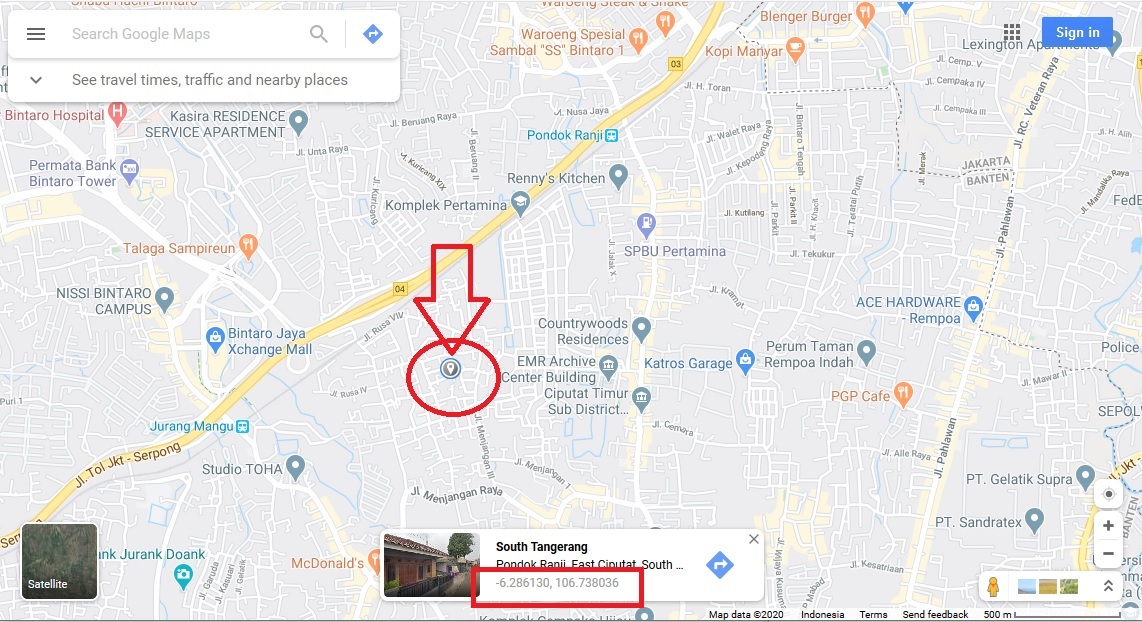 » Klik lokasi jika sudah ditemukan dan akan muncul lokasi lintang dan bujur di bagian bawah (lihat gambar)